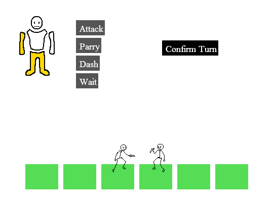 You’ll notice the graphics of a body at the top left of my prototype screen; there are five different parts of the body that are separate targets: the head, torso, left arm, right arm, and legs. When you take damage, rather than simply losing “health”, one of these parts of your body is damaged. And if one part of your body gets damaged too much, you lose. Likewise with the opponent. And depending on which part of your body is damaged, certain actions will be restricted. For instance, take too much damage to the legs and you can’t move.