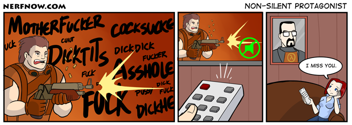 Normally in video-games there is a subtle conflict between the narrative voice of the protagonist and the player. That is to say, who is actually talking or acting — the protagonist of the story, or the person controlling them? They are often mutually exclusive; the more dialogue that a protagonist is given, the less voice the player feels they have. This is why so many video game heros are so infamously silent: any dialogue from the protagonist runs the risk of alienating the player and separating him or her from the game.