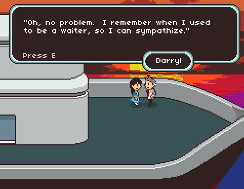 And just as importantly, having certain choke-points for the story allows me to do things such as have small periods of time pass, or move characters move around, and so on. This isn’t trivial. A weird thing about the last game was that, to preserve an interesting pace, characters had to spill their guts to each other very quickly, without knowing anything about each other! It was possible to suspend disbelief, but definitely felt off. This time around I want dialogue to feel more organic, which means at least the illusion of some time passing.